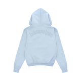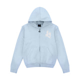 Washed & distressed baby blue zip hoodie with distressed logo embroidery on the back.