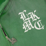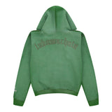 Washed & distressed Green zip hoodie with distressed logo embroidery on the back